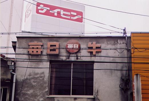 毎日牛が食えるのか?リッチな人もいたもんだ・・・ それともまさか後ろの看板とあわせて読むのか? ケイヒン(景品?)毎日牛・・・時代に逆らったバブリーな番組でも存在するのか?