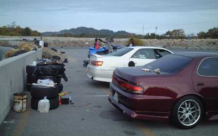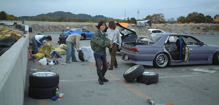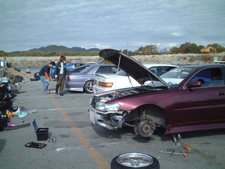 | 備北に到着は9時前、あれ!大地君がいないぞぉ〜? なんと、今度はフロントタイヤにトラブルで・・・ 遅れて来る雅和君と中国道で合流。約1時間遅れで 備北に到着。朝からついてない大地君・・? |