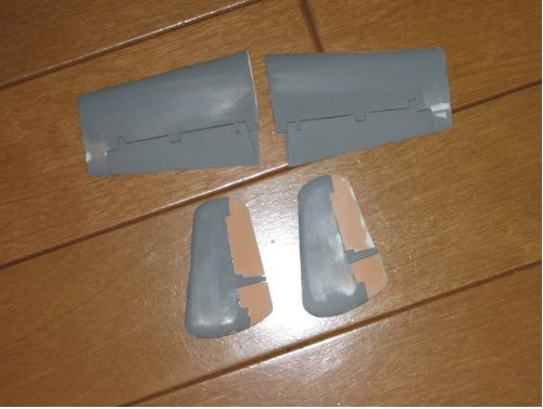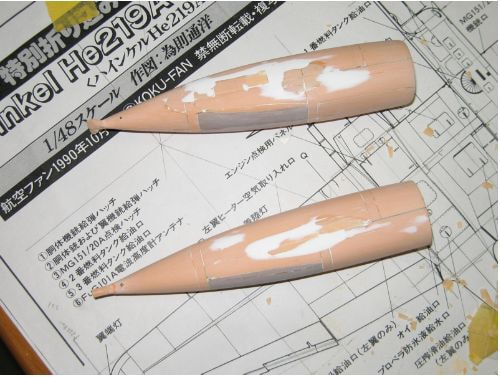主翼はテーパーの切り替えごとに分けて5分割しました。テーパーの切り替え部分がさりげなくはっきりするようにという配慮なんです。が、1体で作るかどうかと比べて、つなぎ目の処理を考えるとどちらの方がよかったかは微妙ですね。ま、努力はしたぞと。ハインケルの主翼平面形には一貫した思想の変遷がありますね。He70ではプラントルの理論に正直に則って楕円翼。そこから無理してもあんまり直線テーパー翼と性能差がないじゃないかということが分かってきて(多分)、後縁のみカーブさせて様子を見てHe178、He280。で、He219では後縁を直線で纏めつつも3段階に変化させて少しでも楕円翼に近づけようとしている(と思える)。前縁を一貫して一直線あるいはほぼ一直線にしているのは翼端失速対策だろうね。多分今日He219と同じような飛行機を作る場合、内翼は直線テーパーなしで作るだろう。閑話休題。翼型や捩り下げについては分かりません(泣)。He 2 37 16.8-0.715-36.6(root)、He 2 37 12-0.715-36.6(tip)という翼型は多分ハインケル謹製。16.8/12が翼厚比のことか?36.6は最大翼厚位置か?真実は歴史の彼方。それらしく作るしかないね。あと翼をいい感じに作るコツは、おおむね出来たところで等%コードで何本か線を引いてその線にあわせて定規を当てる。隙間があれば凹にパテ盛りあるいは凸をペーパーがけでしっかり面を出すことです。ここに一手間かけるとピンとした男前の翼になるんですね。人の目って翼の左右の長さが数ミリ狂っていてもわからないけど、翼の面が出ていないと何となくぐにゃりとした印象になる。あと後縁のシャープさと各角度も気にしたいところだ(と思っていても出来るかどうかは・・・努力しましょう)。