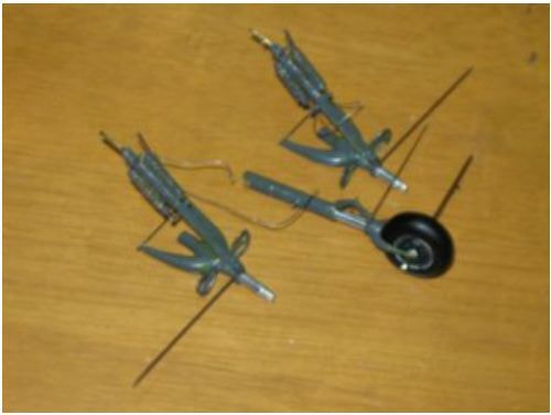 ウーフーの脚って結構大変なんです。主脚はオレオより上が3つ又になっていて、外側2本がナセル内の基部につながり、更に後方にもストラットが伸びているという構成。タイヤもダブルでトレーリングアームに支えられているという、言葉で説明してもよく分からない(笑)。はっきりいってここでスタックしてしまいました(1年弱!)。ディテール感と強度の両立が大変っす。で、何とか未完成病を克服して、アルミ棒(オレオ摺動部)、真鍮棒と真鍮板、洋白板で個々の部品を作り半田付けと黒瞬着で組み立てました。最初は先が見えなくて(うまくできるか分からなくて)モチベーションが上がらないけれど、形になってくると面白くなる。さて3点姿勢を保てるようにバラスト入れまくった重い機体を支えることができるか?