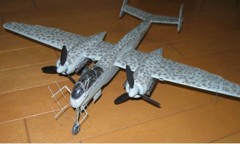 で、何とか形にしました。反省点多々なれどにやにや眺めるのはいいもんだな。他人から観たらつまらん模型でも自分の作った物は自分が一番かわいく思う。親ばかみたいな物か?で、冷静に反省点。ホワイトメタル化したプロペラおよび前タイヤ、スピナ、ナセル、前脚カバーにまで仕込んだバラストのおかげで尻餅つかずに3点姿勢を保つことに成功。で脚も折れずに持ちました。でも最初の段階で脚を付けることを考慮していないといかんよな。泥縄では無駄に時間がかかるという、まあ、物作りの基本ですね。あと、各部のアラインメントにも気をつけたいところだ。此処で模型のしゃっきり感が違ってくる。手先の勘に頼るのではなく極力治具を作った方が早道。いや要のレーダーアンテナがアサッテ の方向を向いてしまった物で。塗装もいい加減。モデルアートの別冊にあった塗装図を元にしたのだけれど、写真では確認しておりませんし、細かい仕様もあっているかどうかはよくわからない。しかしまあドイツ機らしいメカっぽさとハインケル流の優雅さが同居したHe219は(少しは)再現できたかな。