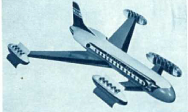 1950年代から60年代にかけてVTOL機っていろいろ構想されたんだよな。超音速が実現したあと、次の目標としてVTOLが目指されたんだろう。今となっては死屍累々という感じですが。ということでこれもその一つ。2流メーカー(失礼)のボールトンボールですから、いきなり暗雲立ちこめるという感じですが、これだけリフトエンジンをつけたらその重量/コストはとても民間機向きではないな。それはなんとかするにしても、離着陸中に18基のリフトエンジンの1基でも故障したらどうトリムするつもりなのか?(通常民間旅客機は1基エンジンが故障しても離陸できるようになっている)能天気な時代だったんだな。「航空ファン」1961年2月号より。