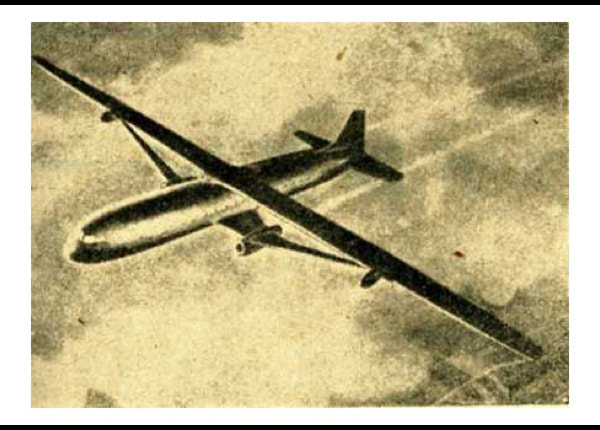 1950年代に常識外れの大アスペクト比主翼を持った旅客機を作ろうとしたユーレ・デュボワ社ですが調子こいてジェット機の計画まで発表しちゃってました。ですが検討不足がめだつプランだ。ジェットエンジンの排気がもろに水平尾翼にかかるというのはいかがな物か。この主翼で高速飛行はフラッターが怖い。そもそも高アスペクト比による揚抗比改善で燃費を稼ぐというのは低速飛行が前提となるけれど、高速飛行のためのジェットとは相性が悪い。真意のほどはとりあえず時流に乗ってジェットもありまっせ的なものなんだろうな。「世界の航空機」1955年2月号より。