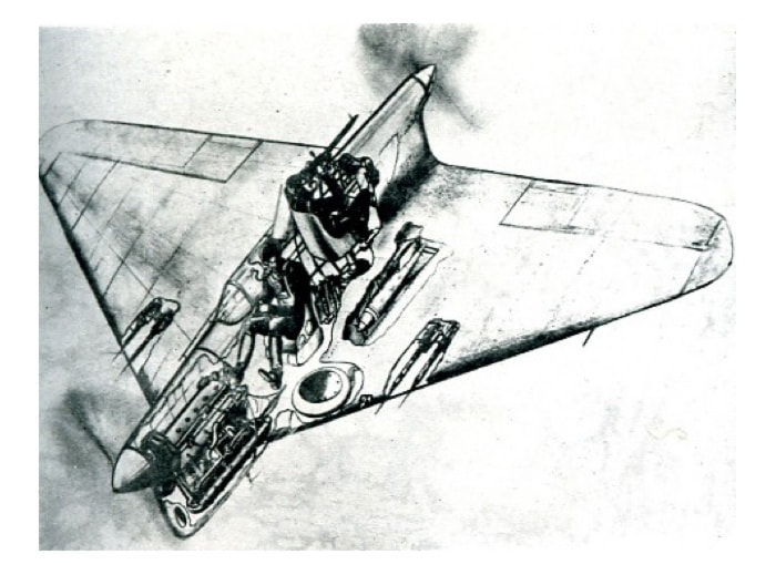 「空」1940年4月号に載っていたこの機体、“米国サン・ルイス・オビスロ州の国立航空研究所のジョン・マツクケラー(ママ)技師により設計され試作中”だそうです。が、こんな戦闘機知らねえなあ。怪しいぞ。垂直尾翼がないというのは許すとして、プロペラ機の速度域でデルタ翼というのは、デメリット(揚力係数が小さくなる、フラップが使えなくなる等)の方が大きい。さらに図をよく見るに燃料タンクが見当たらない!更には後部プロペラ直前に後方射撃用の機銃があるってどう使うのか?脚の配置はどうなっているのか?等々。素人が奇抜さだけを求めてデザインしたかのようで、こうなるとジョン・マツクケラー技師云々も空々しく響くね。同誌には読者の考案した飛行機のコーナーがあるのだけど、それよりも?なのは苦笑するというかなんというか。一体こいつは何なんだ。もちろん実用化なんてされていません。