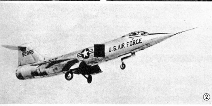 いや別にF-104が怪しいという訳ではないのですが、機体の一部が黒塗りになっているのがネタ的に面白いかなって思いまして。何だか公序良俗に反する物が映っているのかって突っ込みたくなるね。この項に以前に紹介した怪しい(下手すぎる)F-104の記事でも少し触れたけれど、F-104の初飛行時には空気取り入れ口が秘密だったんですね。掲載された写真すべて黒塗り或は空気取り入れ口を外したアングルの写真ばかり。「航空ファン」1956年7月号より。